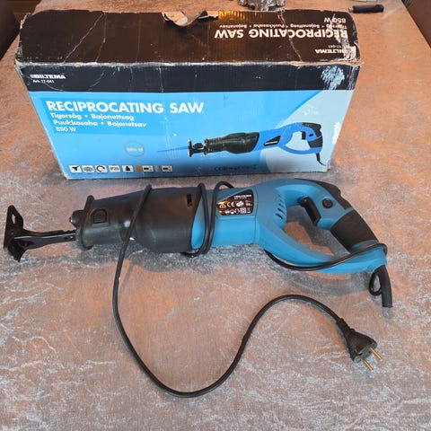 TIL MWT-10E elektrisk bajonettsag med en effekt på 650 watt. Leveres med oppbevaringskoffert og brukerveiledning. Egnet for presisjonskutting i ulike materialer.