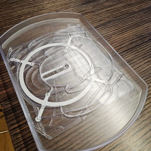 Rundt plastdeksel i hvit farge. Laget av plastmateriale. tilbakeslagsspjeld hvis noen har bruk for det