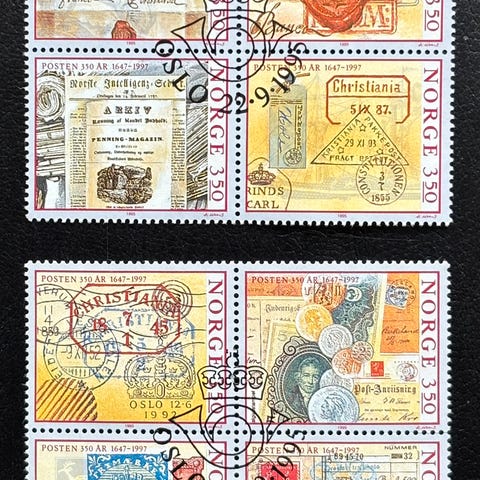 Norge, Posten i 350 år, Sammentrykk med åtte frimerker, 1997, Stemplet
