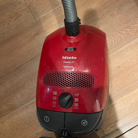 Miele Classic C1 Junior Ecoline støvsuger med hvit farge og kompakt design. Blir byttet ut med håndholdt. Følger med noen nye støvsugerposer.