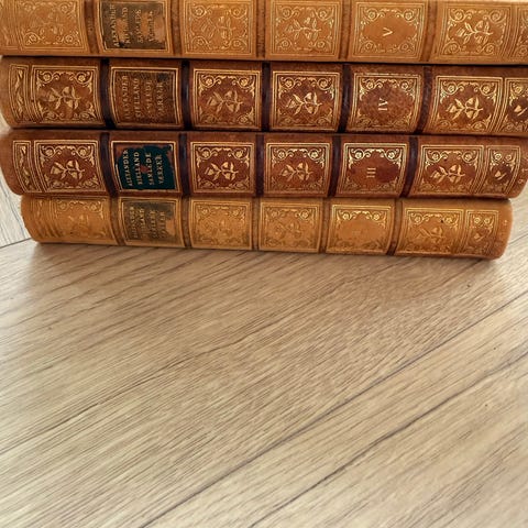Flere bokserier med flere bind, innbundet i skinn med dekorative gullpregede detaljer på rygg og omslag. Serien inkluderer ulike titler og bind i god stand, egnet for samlere eller som dekorativ bokserie.