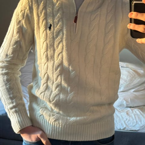Ralph Lauren ull genser i størrelse S for herre. Genseren er blå og laget av ullmateriale. Den har en glidelås og kabelstrikket mønster.