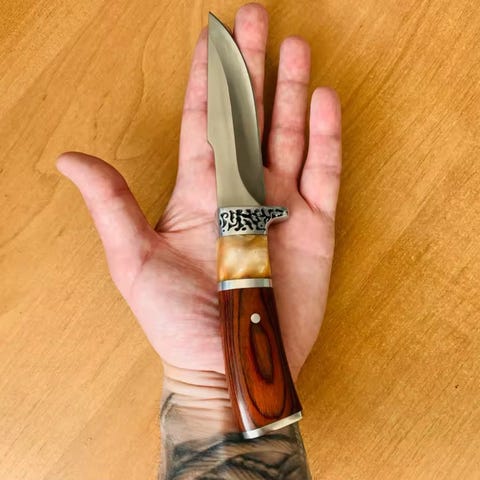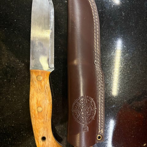 Selger en solid fastbladet turkniv med mørkt trehåndtak og karakteristisk blad med rått uttrykk. Kniven har god balanse og passer perfekt til tur, friluftsliv og samling. Klassisk design kombinert med naturlige materialer gir et tidløst preg. Leveres med lærslire for praktisk oppbevaring og bruk. En flott kniv for deg som liker funksjon og stil i ett.