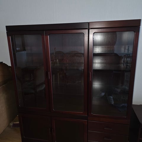 Stor og solid skjenk/vitrineskap i mørkt tre.