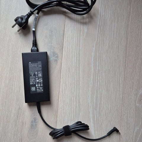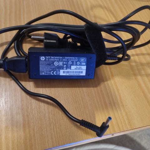 HP strømadapter for PC med standard strømkabel og europeisk plugg. Adapteren er svart og har ulike sikkerhets- og sertifiseringsmerker på etiketten. Passer til kompatible HP-enheter som krever denne typen adapter.