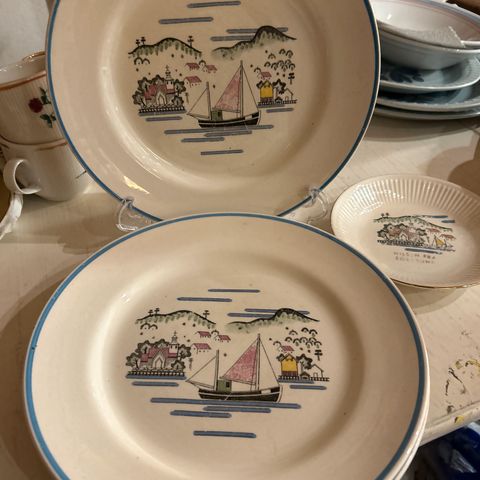 45 deler : 8 tallerkener, 8 dype tallerkener, 8 asjetter, 7 kaffekopper med skåler, 8 små skåler; keffe-/tekanne, fløtemugge, sukkerskål, 2 serveringsfat. Alle deler har stempel