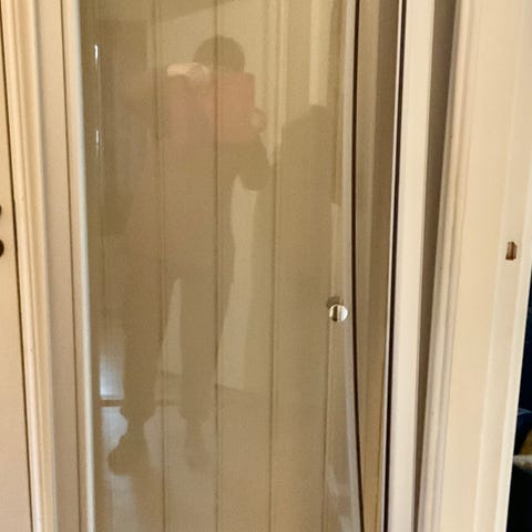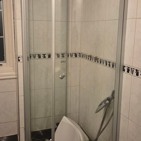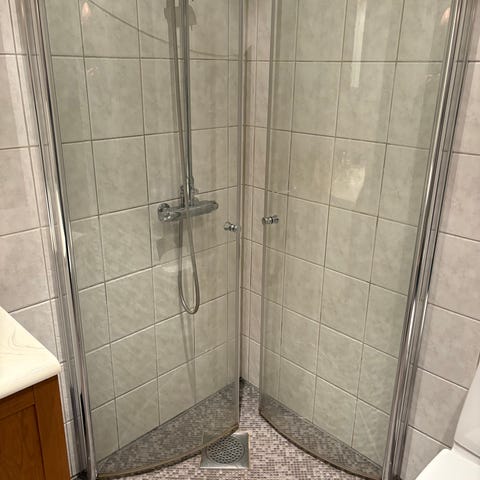 Eldre modell av Showerama dusjvegger i herdet glass. Alt fungerer og blandebatteriet følger med om det er ønskelig.