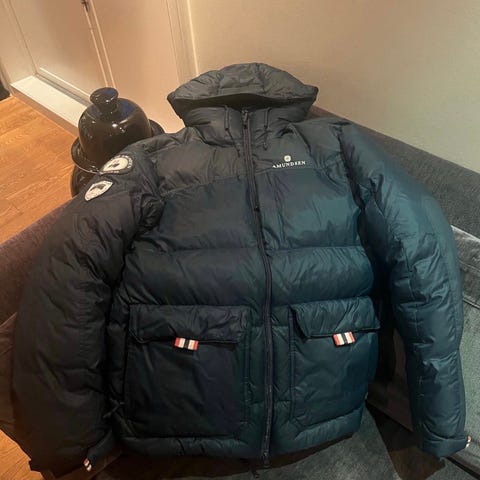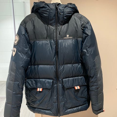 Amundsen Peak herre dunjakke i størrelse M, fargen blå. Jakken er laget med dunfyll for isolasjon og har detaljer som Arctic Expedition-merker på ermet. Designet for å gi varme og komfort i kalde forhold og milde forhold. Utrolig pen jakke som man kan ha nytte av i de fleste forhold.