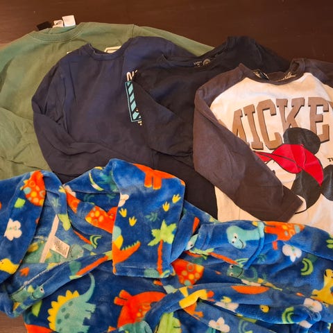 Fin collage genser med traktor, gravemaskin og annet. Hva mer trenger en liten pode?! Buksa følger med. Er et lite hull i kneet som må lappes.