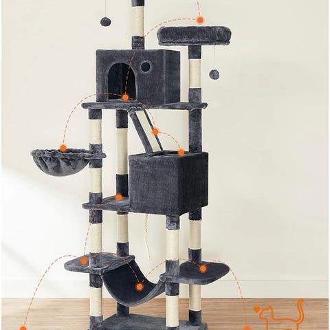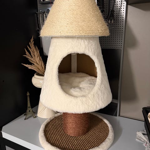 Handmade kattetrestativ laget i tre med flere plattformer og tauinnpakning for kloreaktivitet.