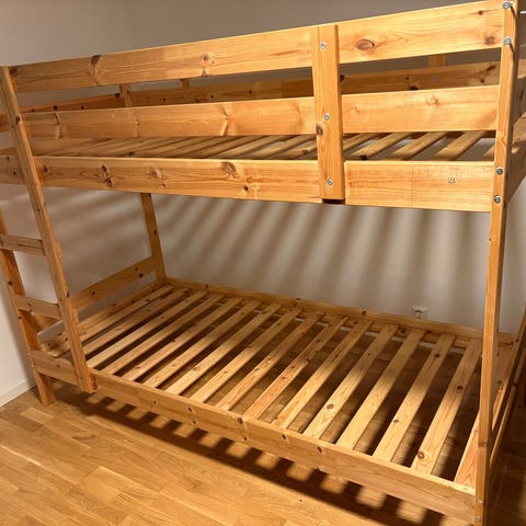 Køyeseng i furu, inkludert en rammemadrass til nederste seng.