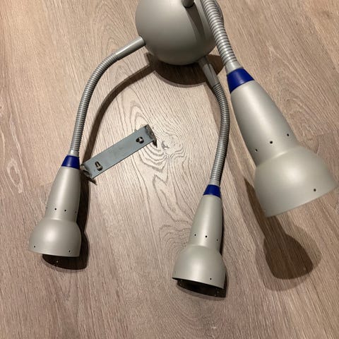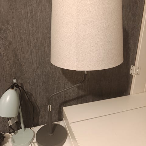 Godt brukt stålampe (halogenlampe). Gir veldig godt lys. Har noen bruksmerker (se bilder). Det ligger noe støv oppi som vi ikke får ut.. Lampen er 180cm høy.