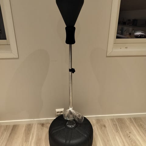 Boksesekk med ball, røde hansker og fotplate. Egnet for trening og boksing innendørs for barn. Stangen kan justeres