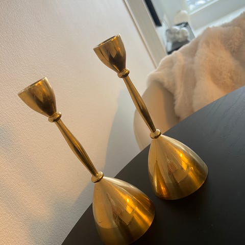6 stk gullaktige lysestaker selges samlet til oppgitt pris. Kun brukt noen julaftener sammen med Royal Copenhagen sitt serviset stjerneriflet jul.
