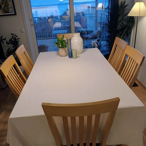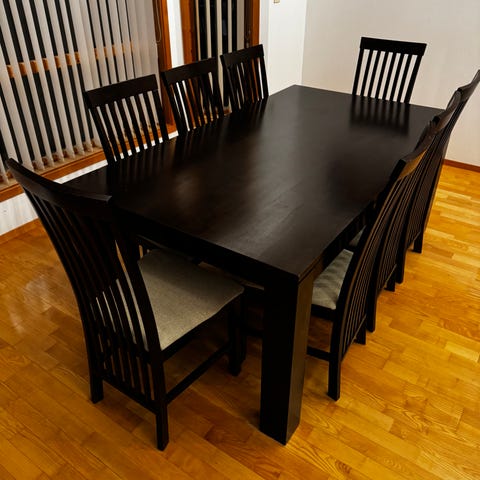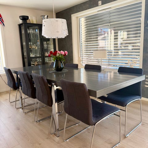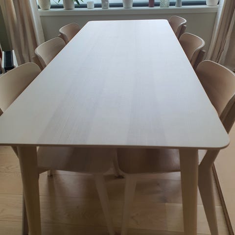 Spisebord og 8 stoler fra skeidar selges samlet. Det er godt brukt da vi har barn og katt. En del kloremerker på stolene og noen hakk/merker på bordet. Selges derfor billig.