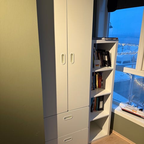 Garderobeskap og bokhylle med skuffer