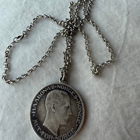 Klassisk norsk myntbrosje i sølv, stemplet 830S. Montert med 2-kronen fra 1906 – minnemynten som markerer unionsoppløsningen i 1905, med teksten «Norges Uafhængighed Gjennemført 1905». Rammen har dekor i nasjonalromantisk/dragestil med karakteristiske masker, og gir et solid og tradisjonelt uttrykk. Nål og lås fungerer fint.