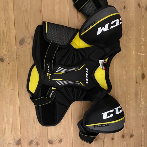 CCM Ishockeybeskyttelse sett bestående av beskyttelsesvest, albuebeskyttere, hansker, shorts og leggskinn. Farge: svart med røde og hvite detaljer. Passer til ishockeyspillere.