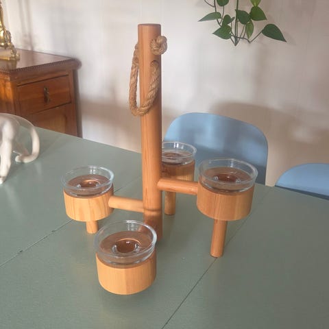 Stilig lysholder som kan brukes til både høye tynne lys og telys. Tre og glass. Tenker den også kan brukes til servering av f.eks nøtter