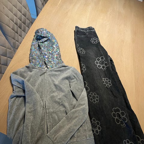 Inneholder 3 bukser, 2 gensere med glidelås og 1 tykkere genser.