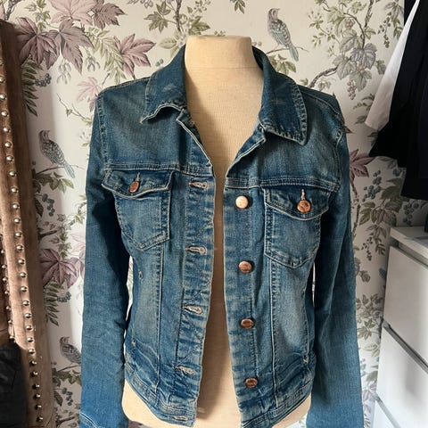 ONLY Denim jakke i blå farge, størrelse M, laget av bomull. Jakken har knapper foran og belte i livet, med en design som inkluderer puffede skuldre. Passer som ytterplagg for kvinner.