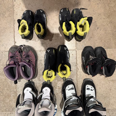 Pent brukt sko til alpint og til langrenn. 100,- per par