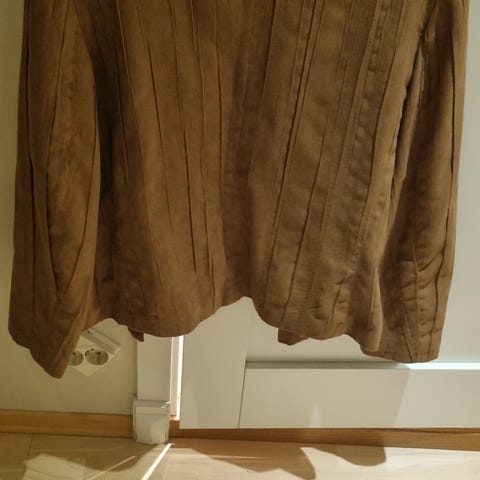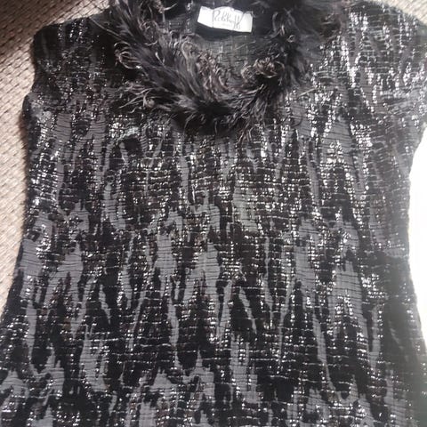 Nydelig sett i litt blankt stoff. Langt skjørt, litt lenger bak enn foran. Topp har glidelås bak. Virkelig vakkert antrekk.