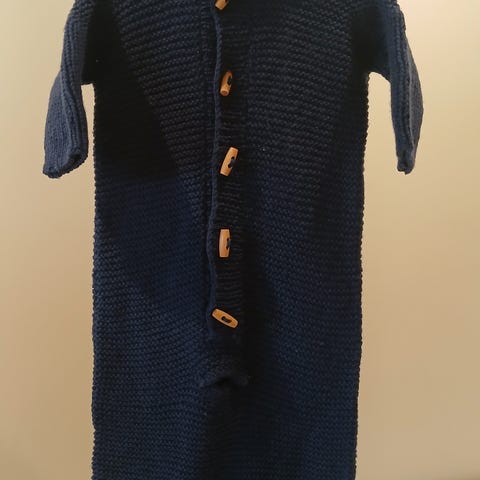 Smart strikket dress/pose for å bruke i bilstol. Har et praktisk åpning for 3/5 pinkts sele