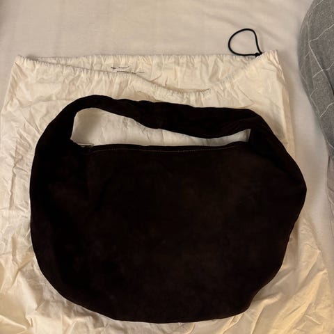 Anine Bing stoffveske for dame i grønnfarge med svarte håndtak og detaljer. Vesken har et enkelt design med logo på fronten og er laget av stoffmateriale. Passer til daglig bruk og kan romme nødvendige eiendeler.