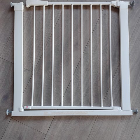 To fine trappegrinder brukt til ett barn i noen måneder . Den hvite er med forlenger og kan åpnes inn og ut , den i tre kan åpnes både til siden og opp . Hentes ved Rikshospitalet. Trappegrind baby