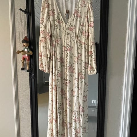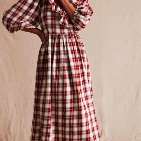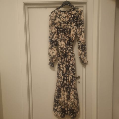 Newbie festkjole i størrelse L. Kjolen er rød og laget av bomull. Den har broderidetaljer på ermene og et V-utringet design. Kjolen har puffermer og belte i livet.