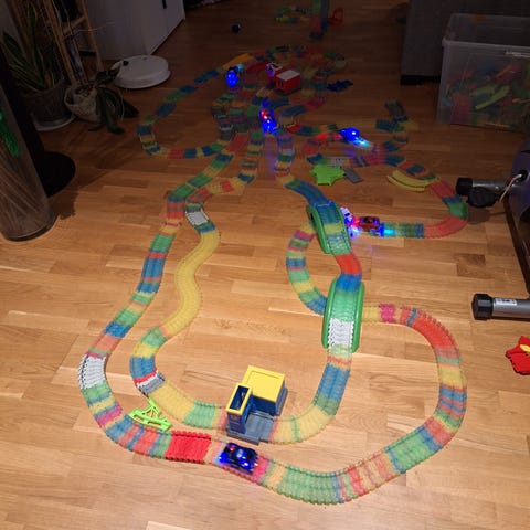 Kul og fleksibel bilbane hvor banen består av mange små ledd som gjør at man kan lage svinger helt fritt. Endestasjonen snur retning når bilen kjører på den. En elektrisk bil med blinkende lys medfølger