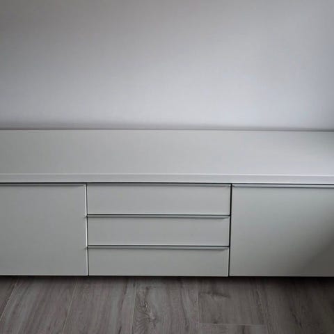 Pent brukt tv benk i hvit farge. Den har noen få merker. Dette produktet er fra IKEA. Den har 2 dører med hylleplater. Også er det åpen hylleplate i midten. Obs! Barnesikring er med på kjøpet hvis man ønsker.