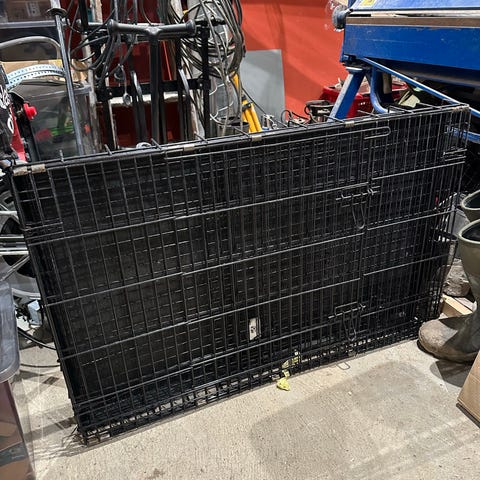 Hundebur i metall med målene 77 cm lengde, 49 cm bredde og 55 cm høyde. Vekt på 6,5 kg. Dørmål: 39 x 41,5 cm (langsiden) og 39 x 39 cm (sidedør).