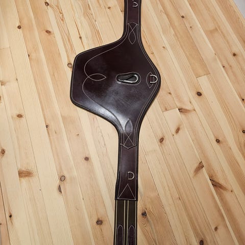 Selger en godt brukt Horze spranggjord med plate da den ikke brukes lenger. Den er 110 cm og i fargen brun. Strikken på hver side av gjorden er strukket litt ut, men har selv opplevd at det gjør den kun enklere å feste. Den har en krok på undersiden som er enkel å feste martingal og strikker i.