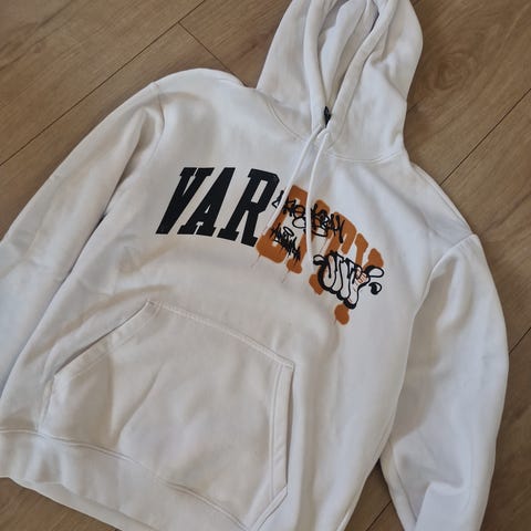 H&M Varsity genser i størrelse L, hvit farge, laget av bomull. Genseren har hette og fleecefôr på innsiden, med ribbestrikkede mansjetter og kant nederst. Passer til hverdagsbruk.