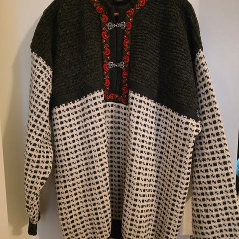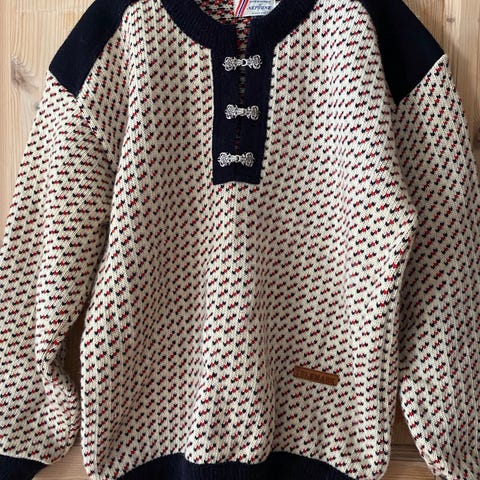 Utrolig flott ullgenser med vadmel og fine knapper. Varm og god
