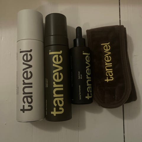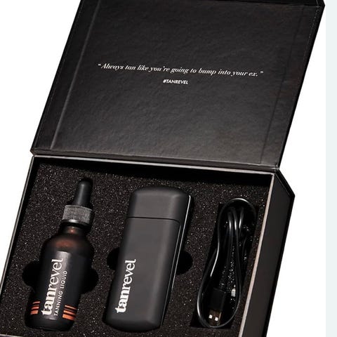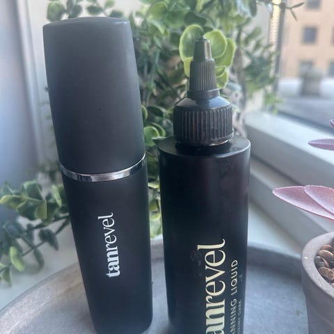 Tanrevel Selvbruningssett består av en enhet og en væske med selvbruningsmiddel. Produktet er designet for å gi en jevn og naturlig brunfarge uten soling.