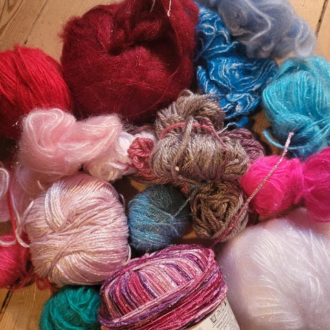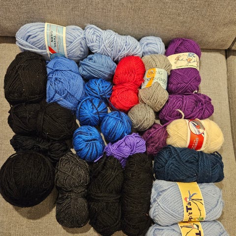 Garnpakke bestående av flere nøster i ulike farger og materialer. Pakken inneholder garn i flere farger som rød, rosa, grønn, blå, hvit, grå, gul, brun og svart. Garnet er egnet for ulike strikke- og hekleprosjekter. Ingen spesifikk størrelse, materiale eller kjønn knyttet til produktene.