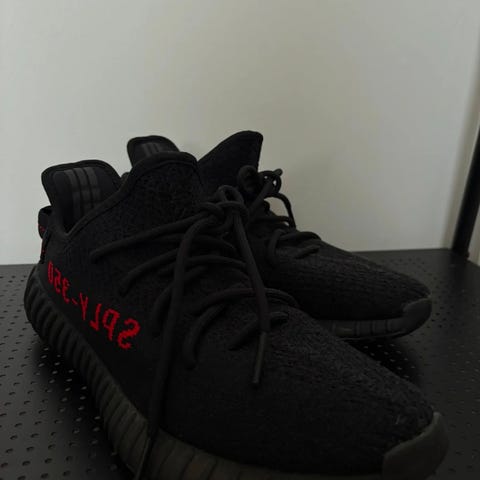 Yeezy 350 Sneakers joggesko i størrelse 42. Skoene har en svart og oransje fargekombinasjon med karakteristisk design. Materialet og detaljer er tilpasset for komfort og bruk.