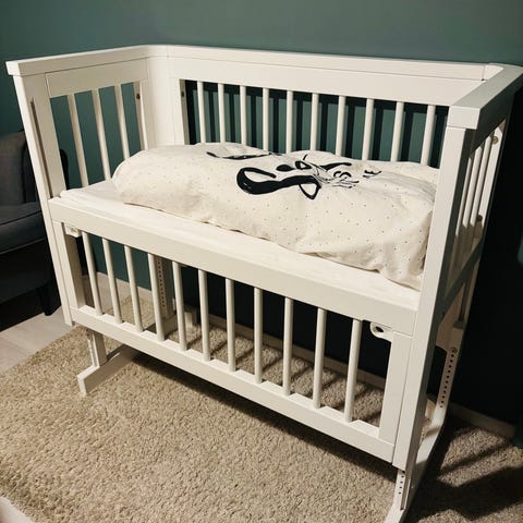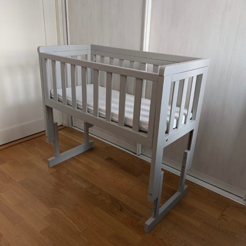 Bedside crib med smart design. Veldig praktisk seng til babyens første måneder. Langsiden er dropside og kan senkes helt. Høyden på sengebunnen kan stilles i forskjellige høyder.