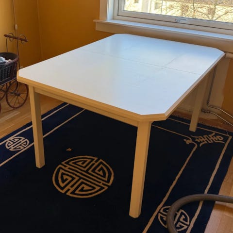 Brukt spisestuebord selges billig. Plass til 6 stk rundt. Noen bruksmerker på beina. Må hentes på Bislett senest 04.01.26