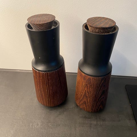 Rosendahl krydderkvern sett i glass med svarte lokk. Settet består av to kverner som kan brukes til å male krydder som pepper og salt. Designet for enkel bruk og påfylling.