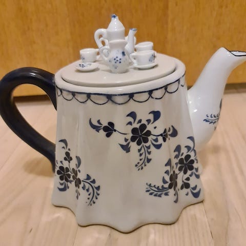 &Tradition Barcelonetta tekanne med tilhørende kopp og skål. Serviset har dekorative mønstre i blått, brunt og hvitt. Egnet for servering av te.