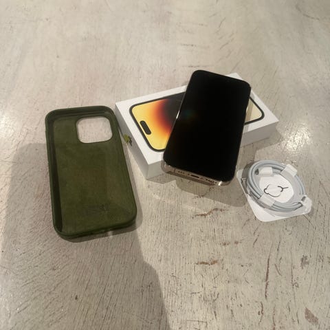 Selger min iPhone 14 Pro Max (128 GB) i fargen dyp lilla. Telefonen har vært i bruk av meg (kvinne, 26 år) og har fungert helt problemfritt i daglig bruk.