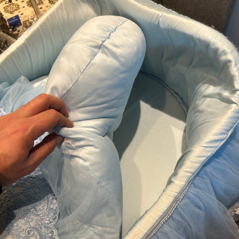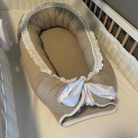 Veldig pent brukt babynest fra Vidas i beige med hvite detaljer. Nestet har en plate i bunnen som kan tas ut og tråder i enden ved sløyfen så den kan utvides og brukes lenge. Det går også an å vaske babynestet. Ny pris 1100kr.