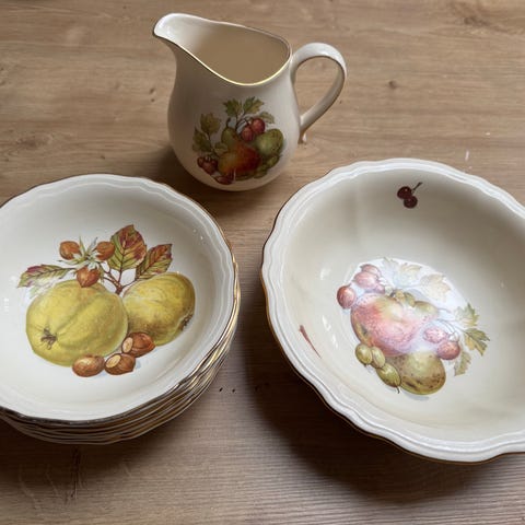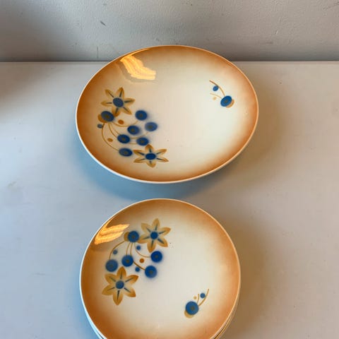 Rosenthal kaffekopper med tilhørende fat og skjeer. Kopper og fat har et dekorativt mønster med fargerike detaljer. Passer til servering av kaffe.
