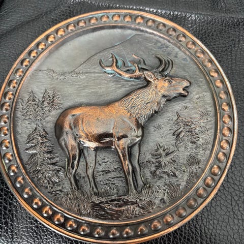 En vegglysestake i messing med et preget bilde av et reinsdyr med barn mot en fjellbakgrunn.