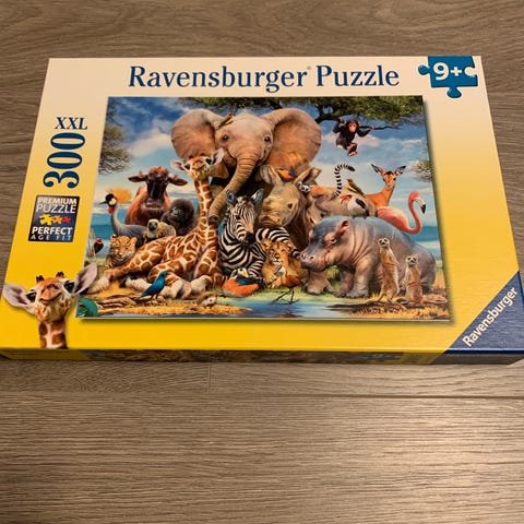 Ravensburger XXL puslespill med 100 brikker. To forskjellige motiver: et fantasymotiv med drage og skatter, og et romtema med planeter og romvesener.