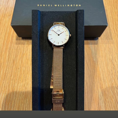 Daniel Wellington dameklokker med forskjellige urskiver og reimer. Den ene har svart urskive med svart rem, den andre har hvit urskive med metallnettrem.